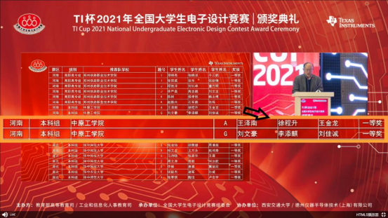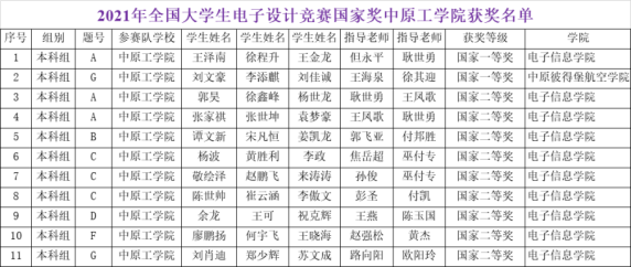 12月19日,2021年全国大学生电子设计竞赛颁奖大会在西安召开,完美体育官网电子信息学院和中原彼得堡航空学院代表学校参赛并取得优异成绩,共获得国家一等奖2项、二等奖9项,河南省一等奖10项、二等奖11项及三等奖23项,完美体育官网获国家奖总数实现了新突破,综合成绩持续保持河南省本科组第一名。本次竞赛完美体育官网共组织94只队伍、282名学生参赛(其中电子信息学院75队,中原彼得堡航空学院19队),是河南赛区参赛最多的院校,参赛题目涵盖了本科组的所有题目(A-G题),是至今完美体育官网参赛题目最全的一次。