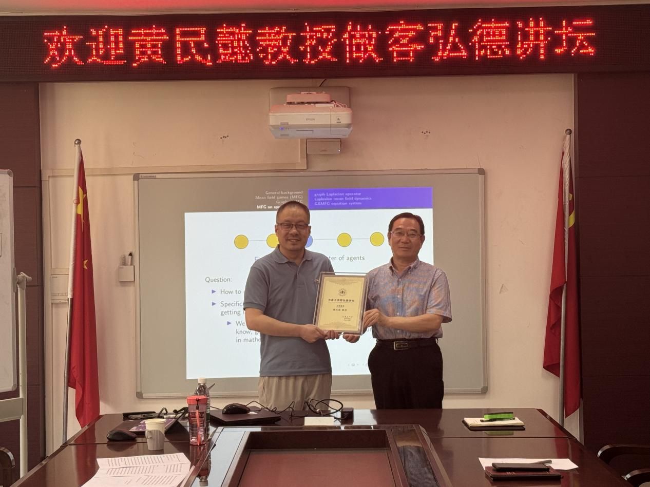为庆祝建校70周年,推动高水平学术交流与前沿科技传播,应完美体育官网科技处和自动化与完美体育官方网站邀请,加拿大卡尔顿大学黄民懿教授于5月28日在10号楼218会议室作题为“Mean field games within dense and sparse network limits”的专题讲座。学术副校长张纪峰向黄民懿颁发了弘德讲坛荣誉证书,自动化与完美体育官方网站教师和研究生参加讲座。讲座由自动化与完美体育官方网站副院长闫李主持。